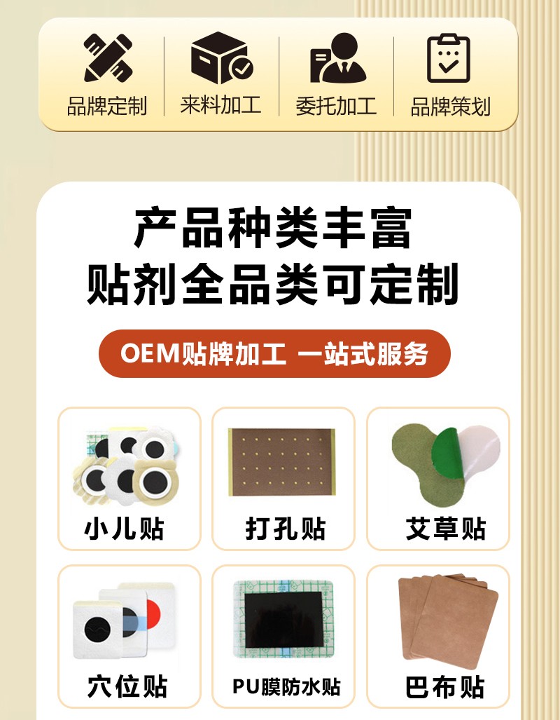 定制化服务:包装设计、贴剂类型(水凝胶、无纺布等)及起订量(1万贴起)灵活可选。