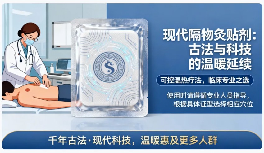 现代隔物灸贴剂作为医疗器械产品,为临床提供了可控的温热疗法选择。使用时请遵循专业人员指导,根据具体证型选择相应穴位。 当千年古法遇见现代科技,隔物灸正以崭新形态,在临床一线延续着它的温暖使命——有效的温热疗法,惠及更多需要的人群。 温馨提示:本产品需在专业人员指导下使用,不同证型应选取相应穴位。温热疗法虽有诸多益处,但仍需辨证施用,如有健康问题请咨询专业医疗人员。