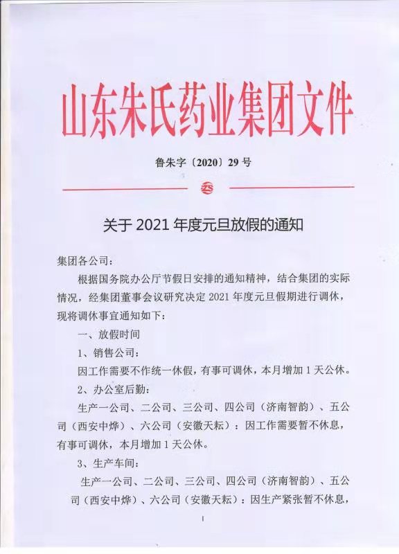 山东朱氏药业集团春节放假通知