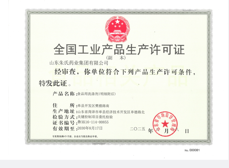 在 大健康产业多元化发展的背景下,山东朱氏药业集团 凭借其 技术创新 和 严格质量管理,成功获得 食品用洗涤剂生产许可证,标志着企业在 食品清洁领域 的 业务拓展 迈出了重要一步。这一成就不仅体现了企业的 综合实力,更展现了其在 多领域布局 中的 战略眼光。以下是 山东朱氏药业集团 获得 食品用洗涤剂生产许可证*的详细介绍: