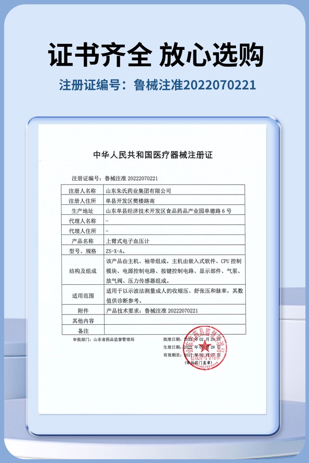 精准守护,权威认证!朱氏药业上臂式电子血压计获国家计量器具型式批准 --- 血压测量,精准是关键。家里备一台可靠、准确的血压计,是对自己和家人健康的基本守护。 今天,我们带来一个重磅好消息:山东朱氏药业集团有限公司自主研发生产的 【上臂式电子血压计(型号:ZS-X-A)】,已正式获得 国家《计量器具型式批准证书》(CPA证书)! 这标志着该产品在精准度及可靠性上,完全符合国家法定要求,可以放心选购,为您的健康保驾护航。