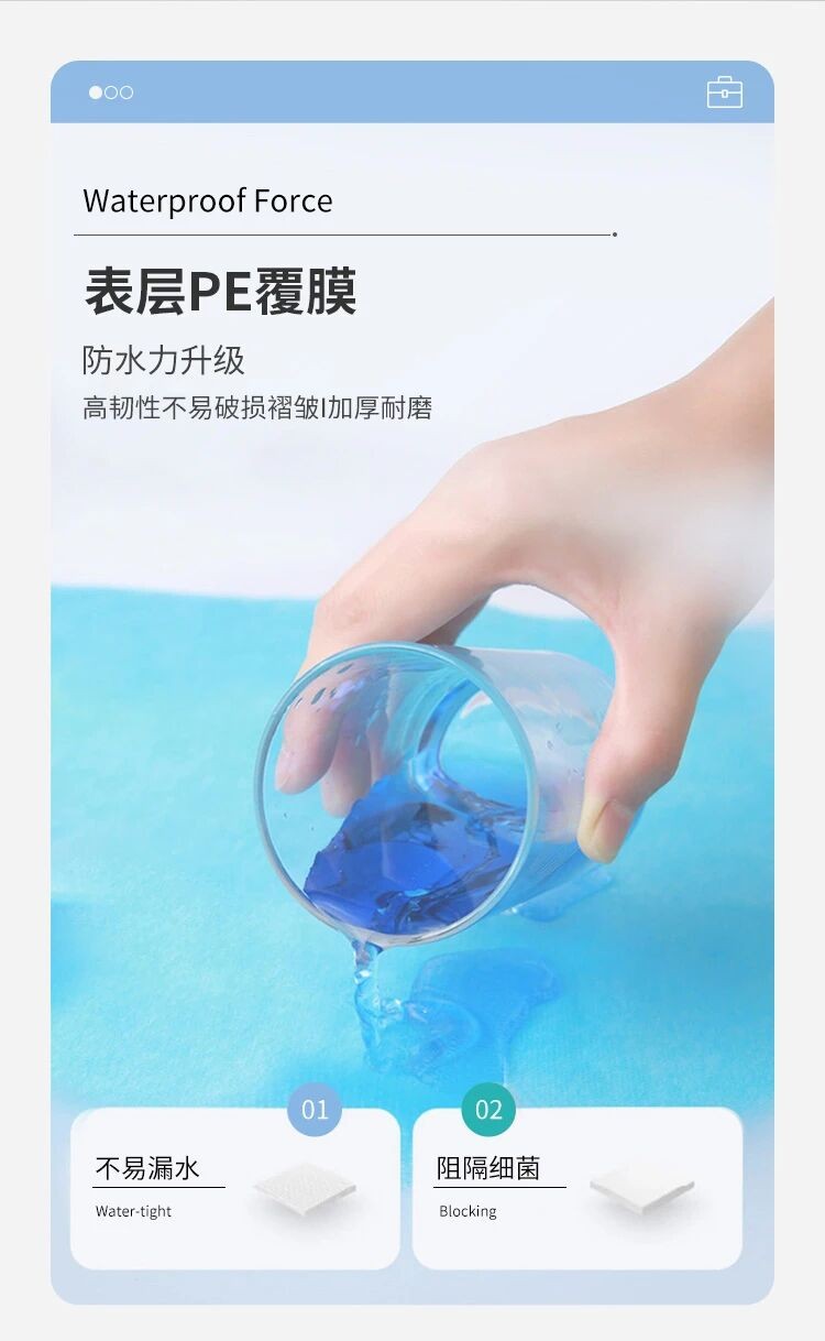 · 医疗机构的好帮手: 适用于各科室手术、检查中体液的隔离防护,能有效防止液体渗透到床垫内部,保护昂贵的医疗床面不受污染,从根源上杜绝交叉感染的风险。