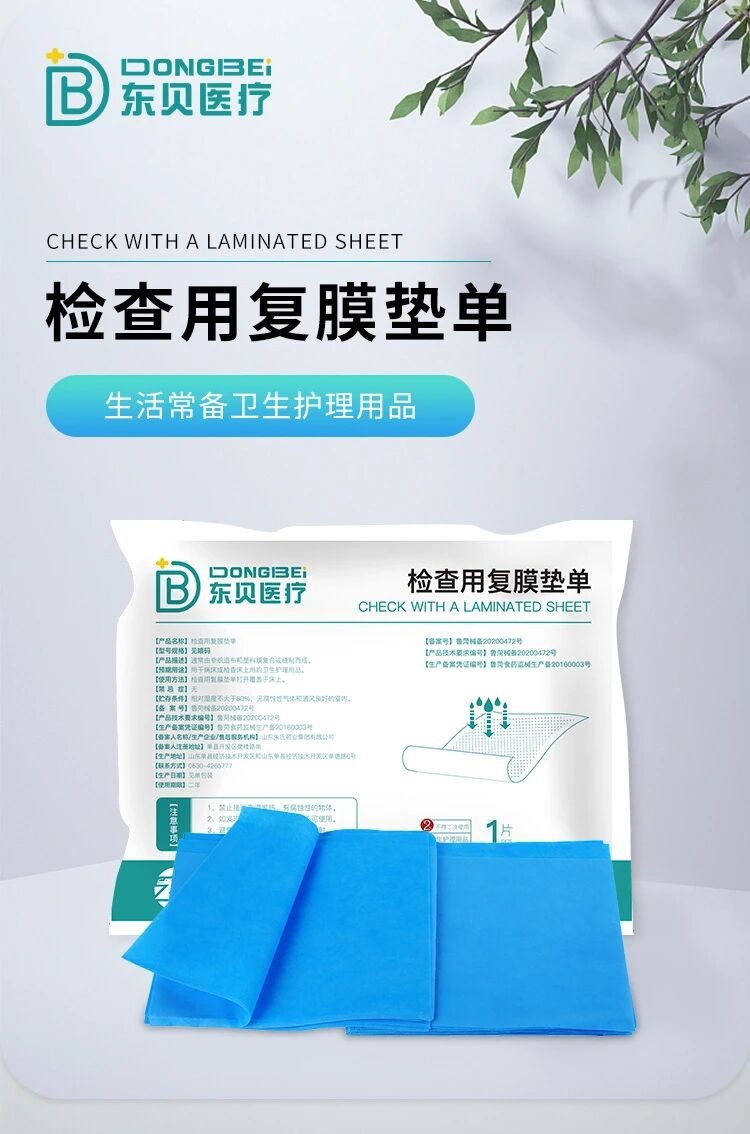 一“垫”多用,卫生守护 东贝检查用复膜垫单,虽然看似结构简单,却凝聚了医疗级防护的智慧。它由无纺布表层和防水PE膜底面复合而成。