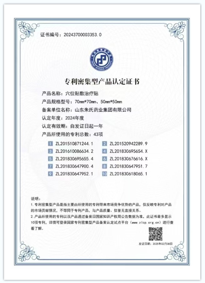 先来看穴位贴敷治疗贴,它传承中医经络理论精髓,结合现代科技,将传统贴敷疗法进行创新升级。通过对药物配方、贴敷材质以及透皮吸收技术的深度研发,我们攻克了传统贴剂存在的药效释放不稳定、皮肤刺激性大等难题。产品拥有多项核心专利技术,能精准作用于穴位,实现药物的优质吸收,为患者带来更健康、更舒适、更有效的治疗体验。不论是日常保健,还是疾病辅助治疗,都展现出了优异的临床价值。