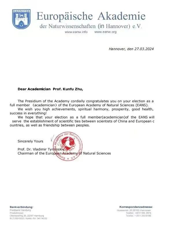 据悉,欧洲自然科学院院士的选举过程极为严格,需要经过院士推荐、投票选举、主席团审议、勋章授予等多个环节,以确保每一位当选的院士都是在各自领域具有卓越成就和广泛影响力的科学家和学者。这一荣誉的获得不仅是对朱坤福先生在自然科学领域取得的优异成绩的肯定,更是学术荣誉和身份的象征。