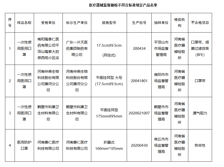 河南省药品监督管理局:4批次口罩抽检不合格