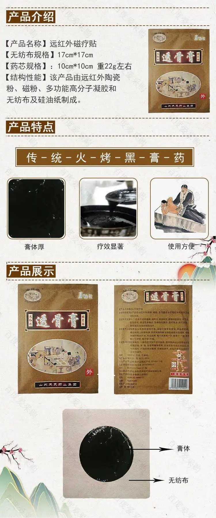 该透骨膏以当归、红花、乳香、没药、独活等 20 余味道地中药材为原料,遵循 “君臣佐使” 的中医配伍原则,通过 “泡、煎、熬、炼” 等多道传统工艺制成,具有活血化瘀、消肿止痛、祛风除湿等功效,尤其针对颈肩腰腿痛、关节炎、肌肉劳损等常见筋骨问题,有着显著的缓解效果。