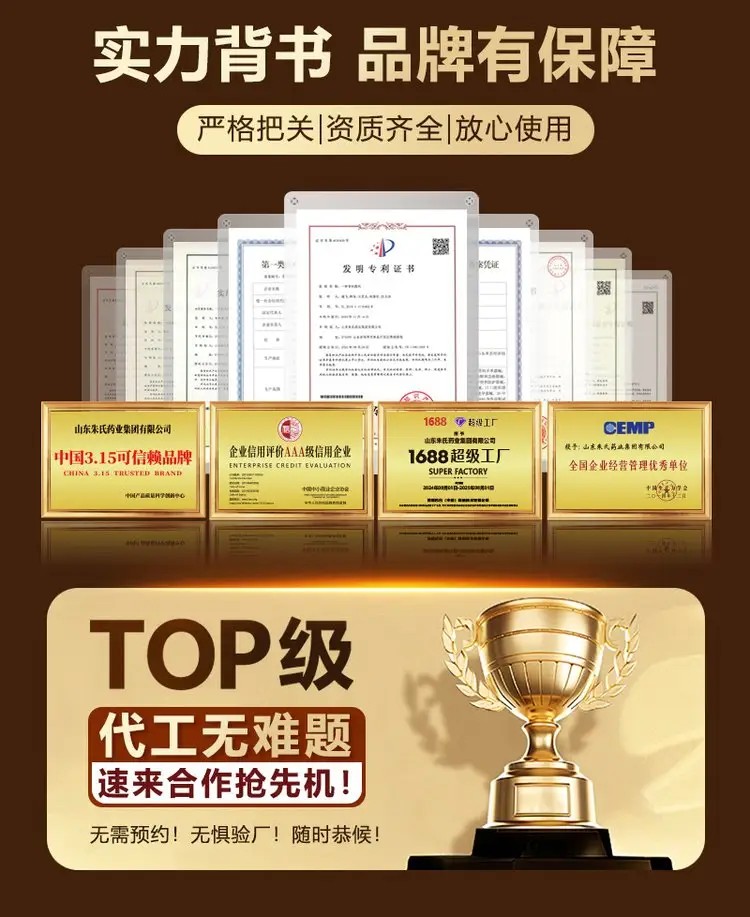 2003 年成立初期,朱氏药业精准抓住中小品牌和创业团队代工的痛点,以低门槛合作和强合规背书快速积累客户。在定制方面,它打破传统代工的高起订量规则,将医用冷敷贴等常规品类最小起订量降至 500 片,健康食品类低至 500 份,还能提供配方和包装的全环节定制。