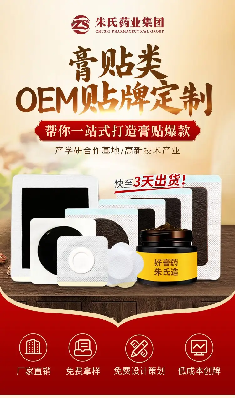 灵活贴牌,快速抢占市场支持配方定制、规格调整、卡通 / 医用双风格包装设计,免费打样,小批量 7 天极速交付!专业团队全程提供合规指导,协助产品备案、标签设计,让您省心省力,轻松推出专属三九贴爆品。