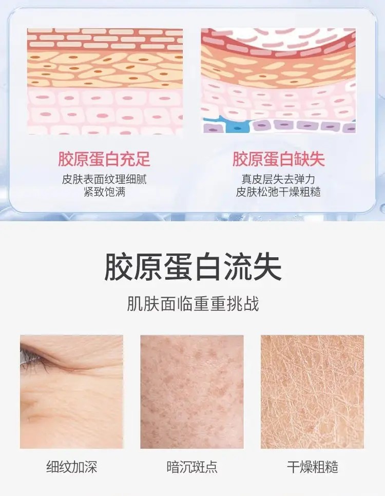 胶原分子在肌表形成透气保护膜,隔绝紫外线、污染物等刺激,填补角质层细胞间隙,提升锁水能力,缓解干燥、脱屑、泛红。例如,术后或敏感肌使用后,可快速舒缓红肿,增强肌肤抵抗力。