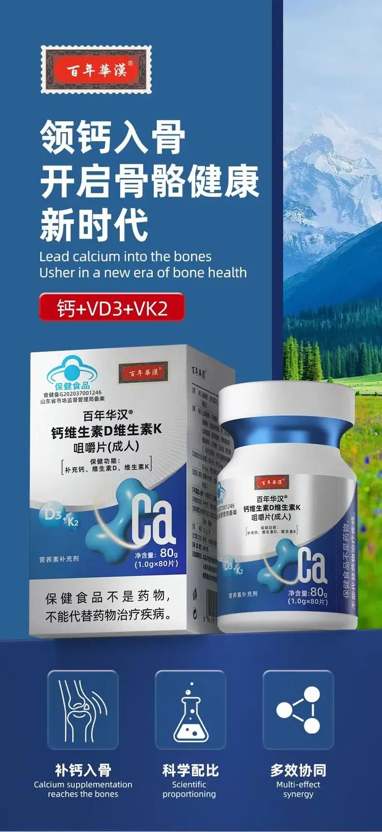 百年华汉钙维生素D维生素K咀嚼片通过科学配比与便捷剂型设计,为现代人提供了高效、灵活的补钙方案,尤其适合快节奏生活下的骨骼健康管理。以下从产品特点、作用机制、适用人群及使用建议四方面展开分析: