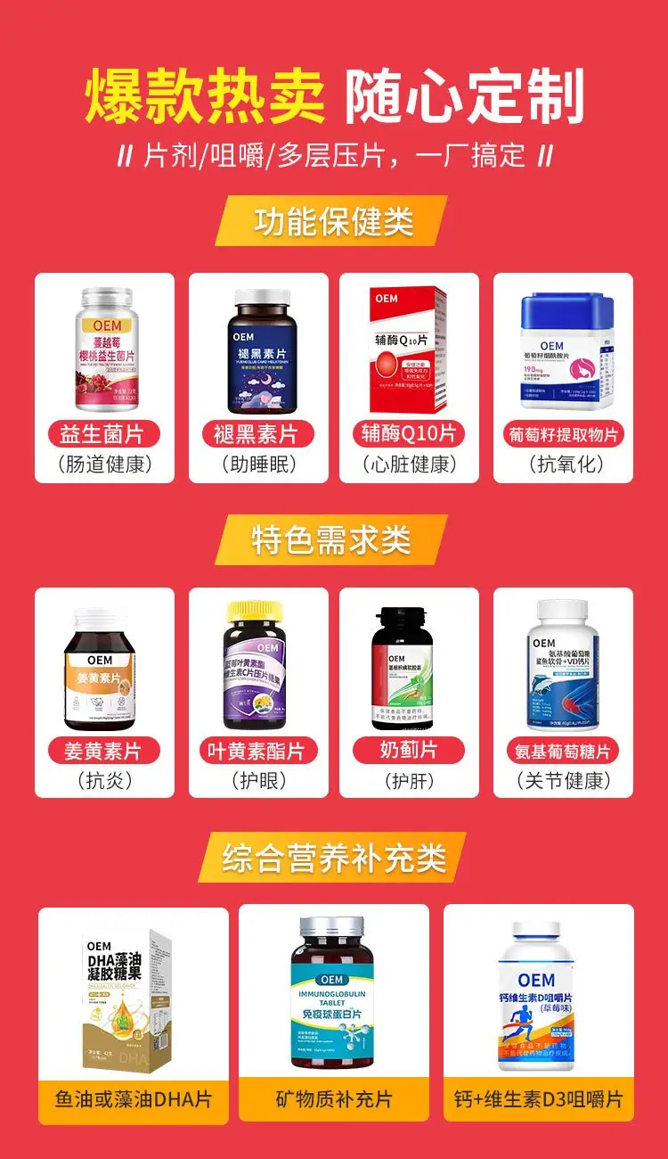 全场景产品矩阵:覆盖全剂型、多场景功能性食品,包括便携速食类的压片糖果、条状固体饮料,传统养生类的人参黄精茶、枸杞原浆,调理类的特殊膳食、功能性饮品,以及潮流消费类的功能性软糖、口服液等,适配不同渠道定位和消费者需求。