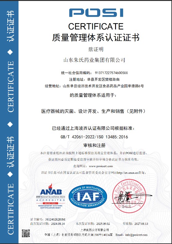 ISO13485 认证是医疗器械领域的国际权威标准,核心聚焦产品全生命周期的质量控制与风险管控。朱氏药业通过该认证,意味着其生产流程、研发体系、质量管理均达到国际水准:
