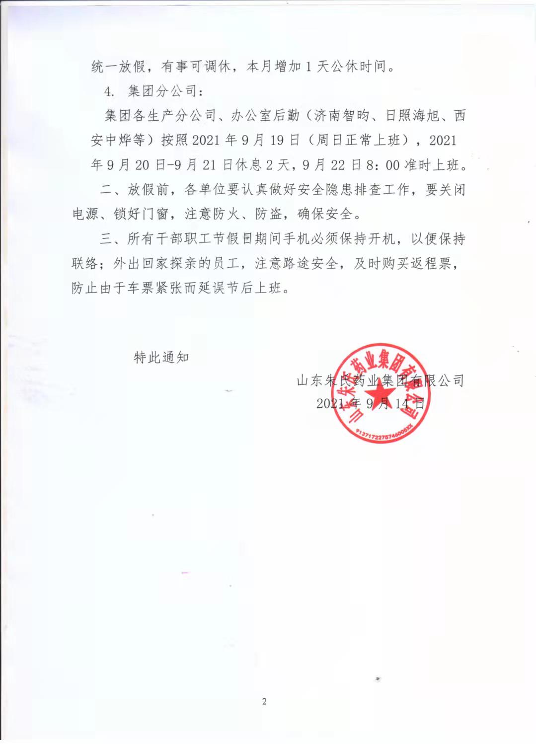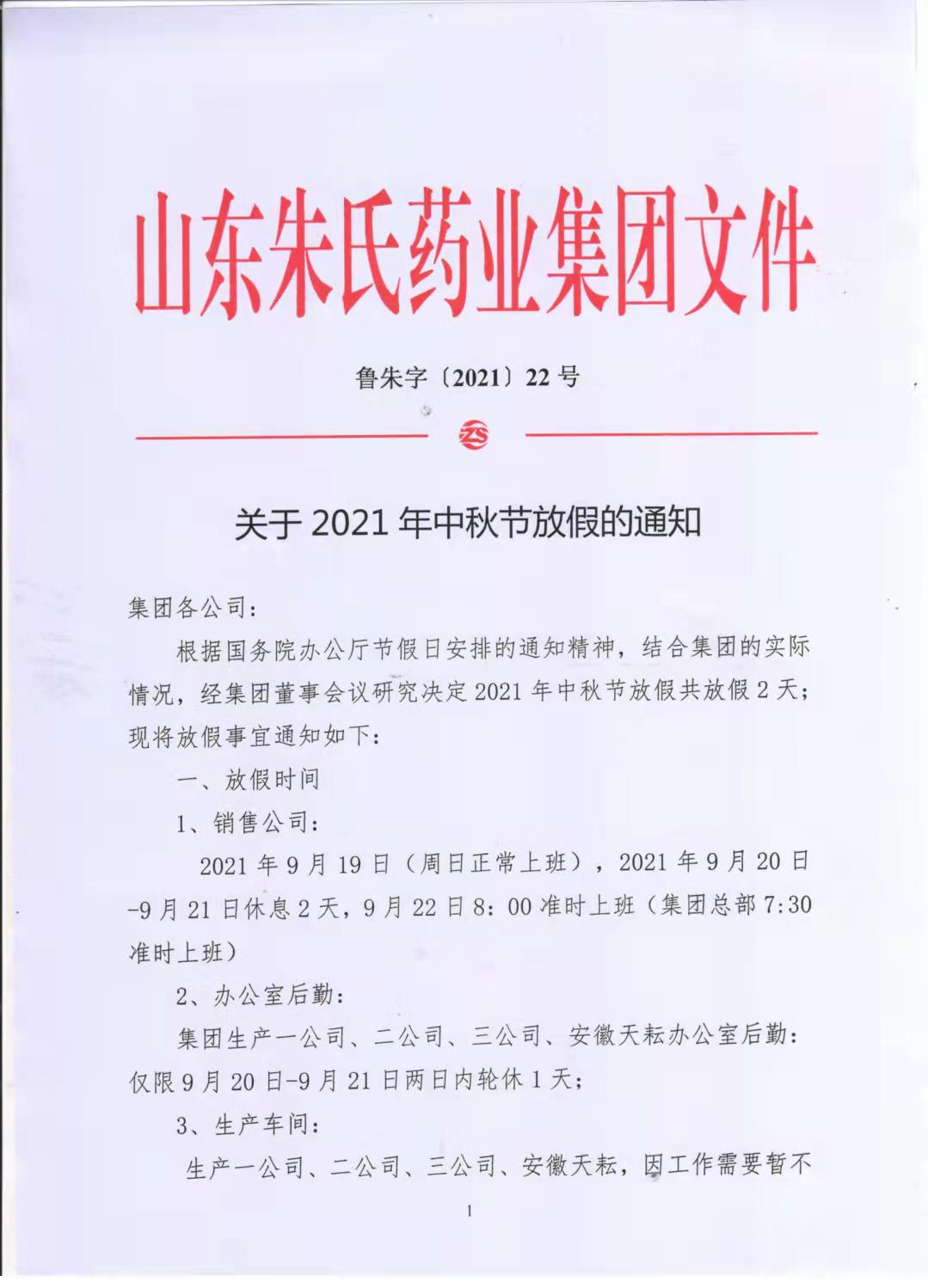 山东朱氏药业集团中秋节放假通知