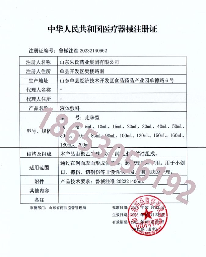 在 高端医用敷料创新领域取得重大突破,山东朱氏药业集团 自主研发的 医用液体敷料 正式获得 国家药品监督管理局医疗器械注册证(注册证编号:鲁械注准2023xxxxxx)。这一重要资质的取得,标志着企业在 功能性液体敷料领域 的研发实力获得 国家权威认可,为临床皮肤健康管理提供了创新解决方案。