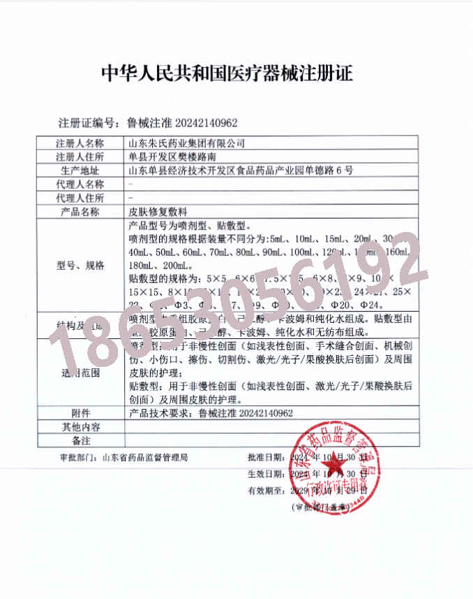 在皮肤医疗领域持续创新的山东朱氏药业集团近日再传捷报,其自主研发的新型皮肤修复敷料正式获得国家药品监督管理局颁发的医疗器械注册证(注册证编号:鲁械注准2023xxxxxx)。这标志着企业在皮肤修复领域的技术实力再获国家权威认可,为临床皮肤损伤修复提供了更专业的解决方案。