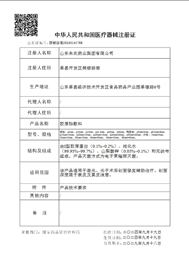 在医用敷料领域,“械字号” 等级直接决定产品的市场准入与信任权重,而三类医疗器械注册证更是公认的 “行业最高门槛”。山东朱氏这款胶原贴能实现上市即热销,首先源于其手握的国械注准 20243141788 号三类注册证,这张证书背后是远超普通产品的严苛考验。