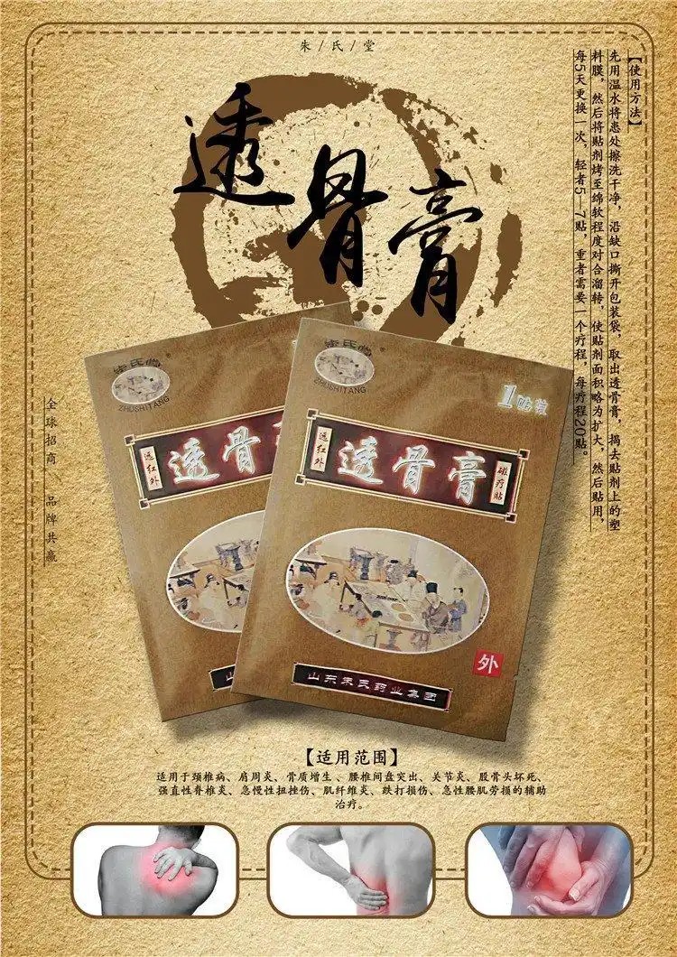 该透骨膏以当归、红花、乳香、没药、独活等 20 余味道地中药材为原料,遵循 “君臣佐使” 的中医配伍原则,通过 “泡、煎、熬、炼” 等多道传统工艺制成,具有活血化瘀、消肿止痛、祛风除湿等功效,尤其针对颈肩腰腿痛、关节炎、肌肉劳损等常见筋骨问题,有着显著的缓解效果。