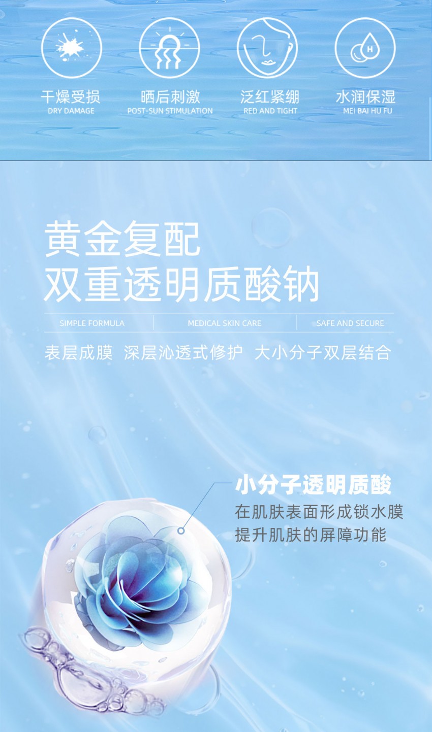 医用透明质酸钠敷料:通过国家第二类医疗器械认证,动态保湿屏障技术可抑制脂膜相变、促进神经酰胺排列,重建健康物理屏障,适用于激光术后修复、敏感肌护理等场景。